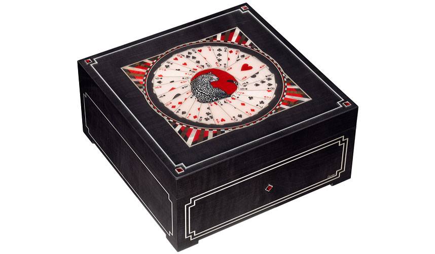 Esta caja de póquer de sicómoro con concha nácar y laca exhibe una armonía de gris, negro, rojo y blanco.