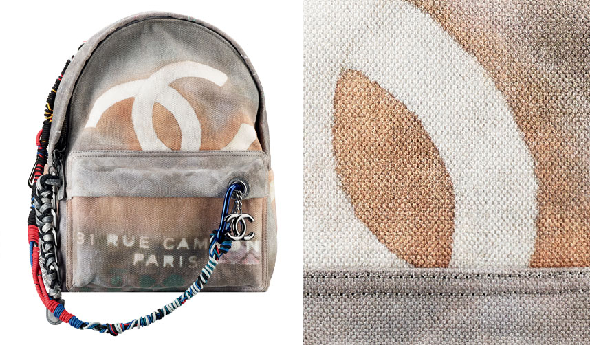 La Backpack tiene una gruesa capa de lino, se necesitan de varias horas de trabajo para realizarla. Cada motivo fue reproducido por un procedimiento específico de impresión que permite la variedad de sombras y efectos de los diferentes colores. Los códigos icónicos como la calidad, las iniciales de metal, la doble C y el logo pintado son recordatorios de la la marca. La etiqueta específica de maletas, tiene un acabado desgastado; la agarradera y la etiqueta del cierre esta hechos de una piel hermosa. Finalmente un listón hecho a mano, entrelazado al gancho de metal, parecido a el amuleto de la buena suerte que usan los adolescentes, agregándole originalidad al backpack.