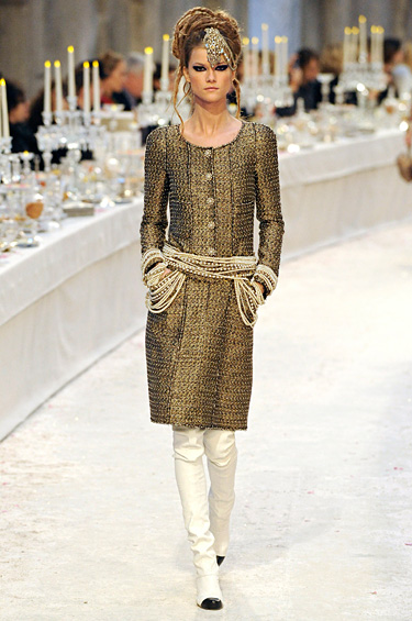 La silueta pasa de hombros suaves a faldas acampanadas, a un traje de tweed bordado de oro con mangas de kimono o con decorado floral en que se superponen vaporosos encajes y muselinas. El principio del sari sublima la silueta. Magnificada en espléndidos drapeados, ultra femenina en ese blusón de hombreras diamantadas, la elegancia revive los atuendos de los marajás en una faceta masculino femenina absolutamente moderna. A imitación del atchkan, este saco de brocado de cuello Nehru se metamorfosea aquí en una sucesión de propuestas: abrigo bordado de oro con pinzas y forrajeras aperladas, abrigo blanco con pechera y bolsillos bordados, chaqueta con martingala de pinzas, con cuello adornado con perlas barrocas, saco para montar y blazers tradicionales con hombros sastre.