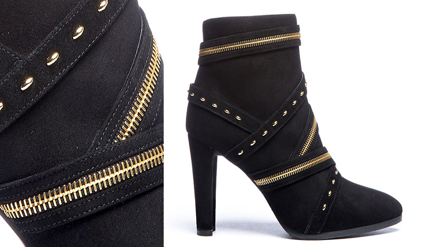 Descubre la bota al tobillo de tacón alto, Pistolero decorada con cierres dorados que se entrelazan y sobresalen del tono oscuro. Combinará con todo y le dará a tu look un toque de brillo.